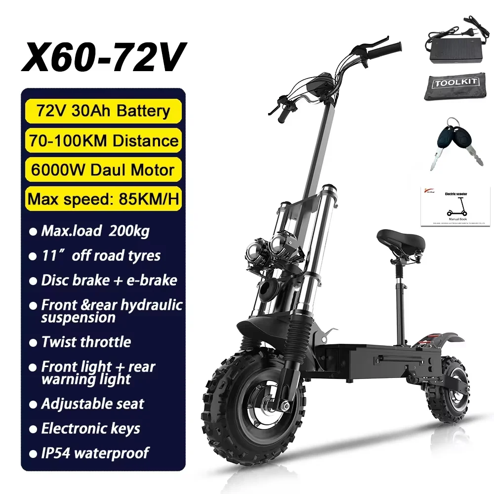 1200W 2400W 6000W Commuter Seated Adults Electric Scooter 48V/72V E-Scooter 10 inch Tubeless Off Road Tire with LCD